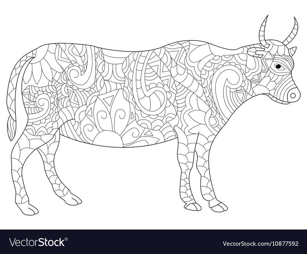 Coloring page with cow zenart stylized hand vector.